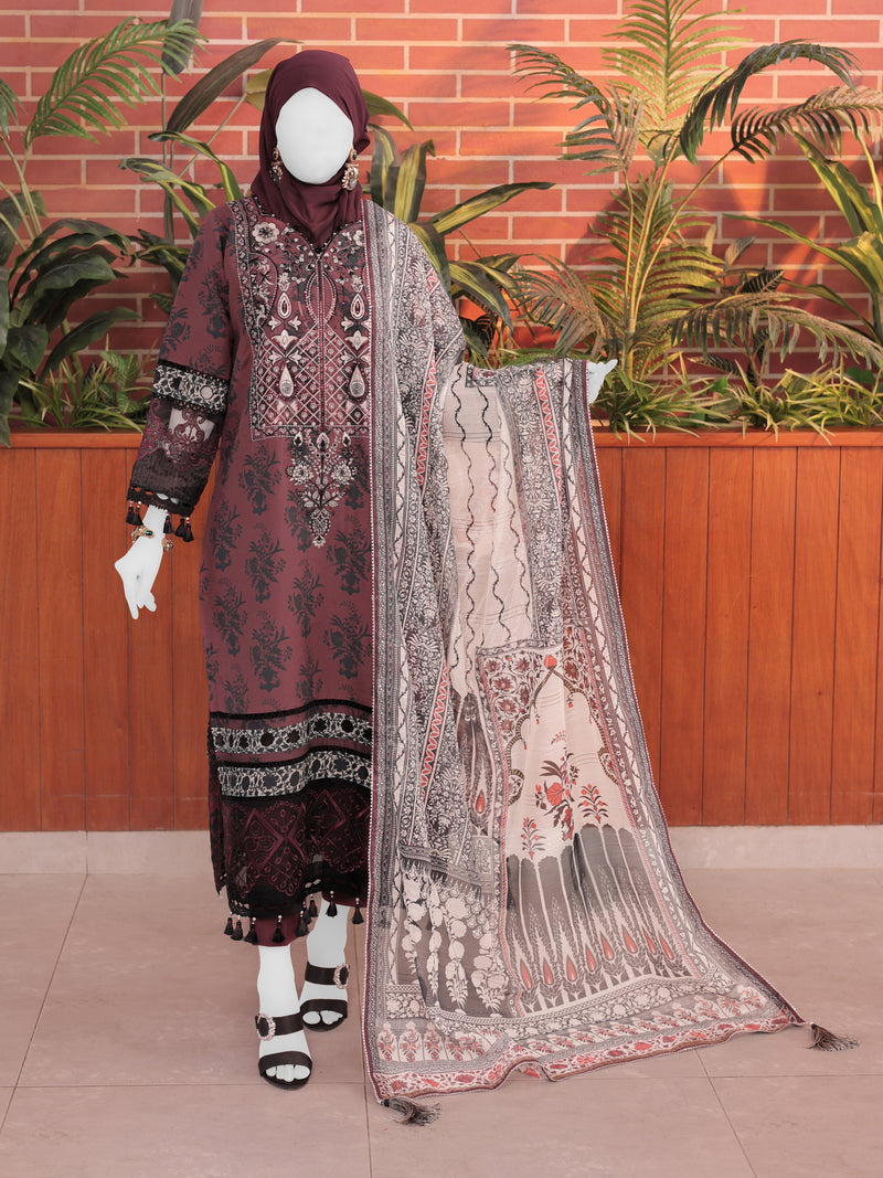 Brown Embroidered 3Pc Stitched Suit | PLS-24-7601