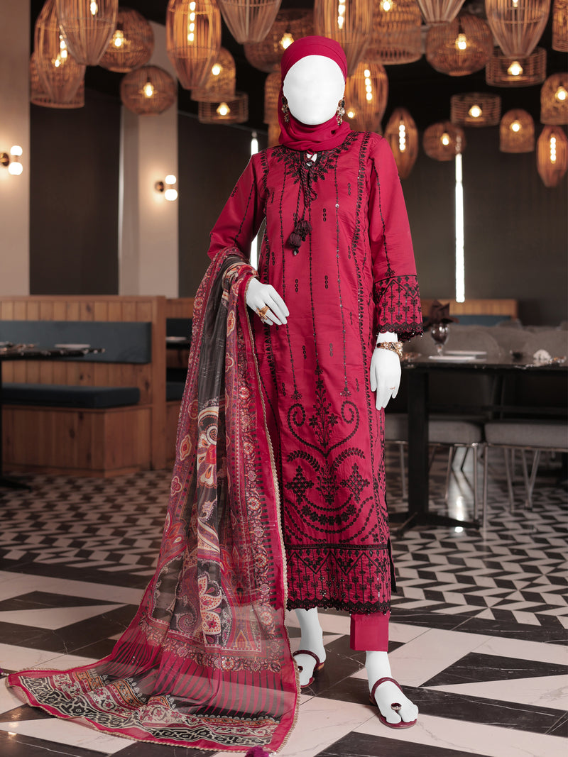 Red Embroidered 3Pc Stitched Suit | PLS-24-7600